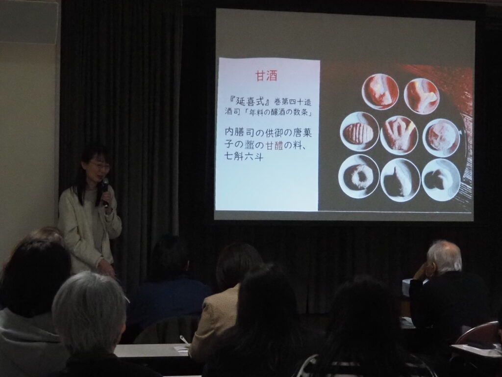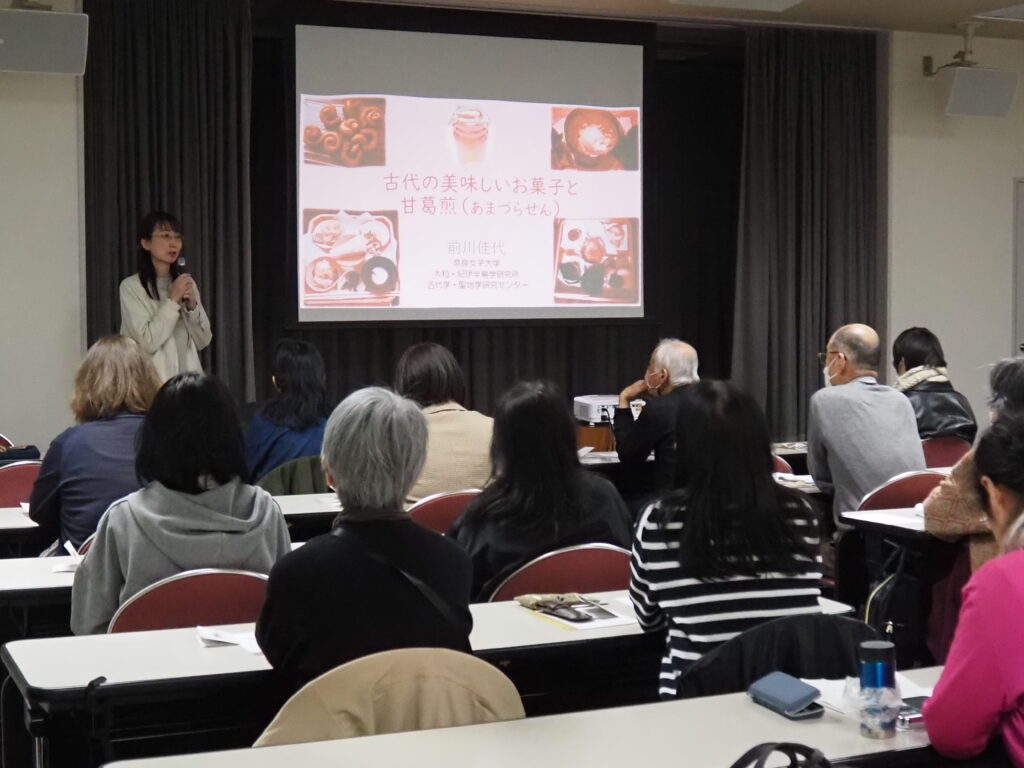 当日は、奈良女子大学大和・紀伊半島学研究所 古代学・聖地学研究センター協力研究員の前川佳代氏を講師にお迎えし、古代における菓子文化や甘味のついてご講義いただきました。