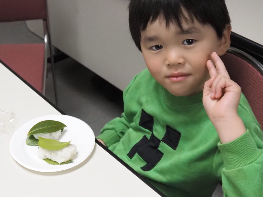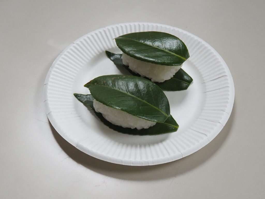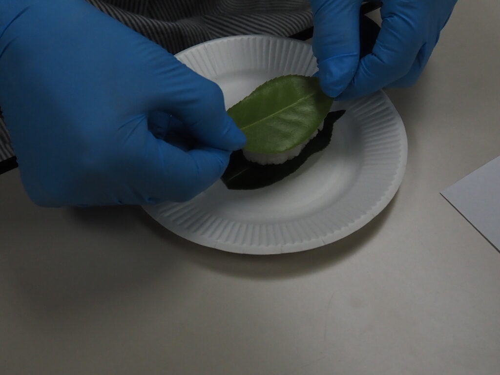 椿餅は、餅を椿の葉で包んだ素朴な菓子で、平安時代の食文化を今に伝える貴重な存在です。今回使用した椿の葉は、講師が前日に当館前に広がる県営狭山稲荷山公園にて採取されたもので、地域の自然を活かした体験となりました。