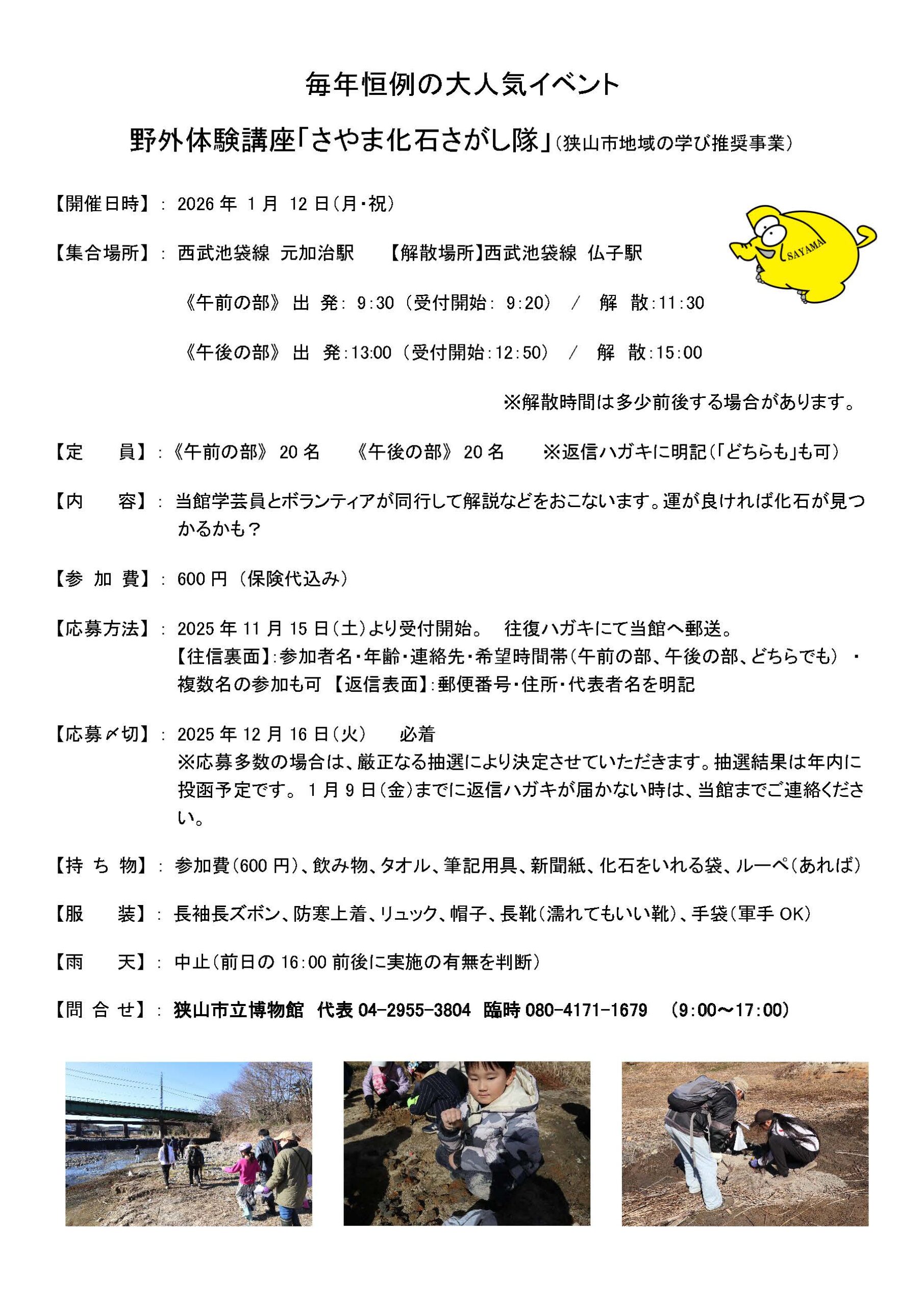 毎年恒例の「さやま化石さがし隊」を開催します!!