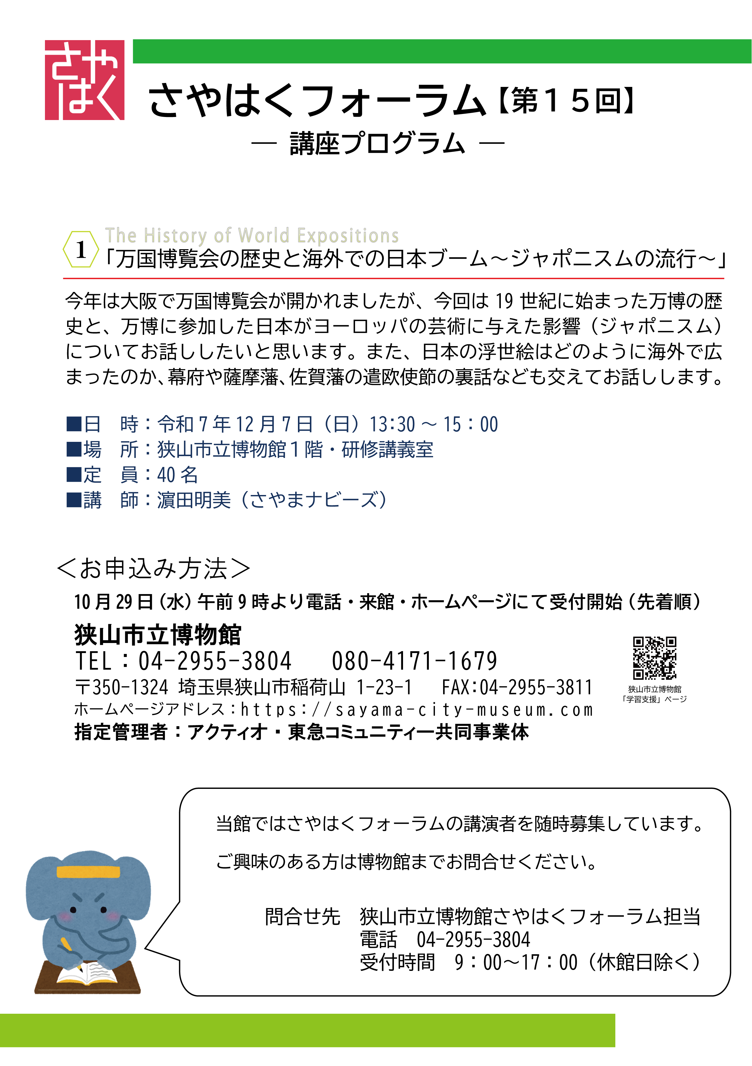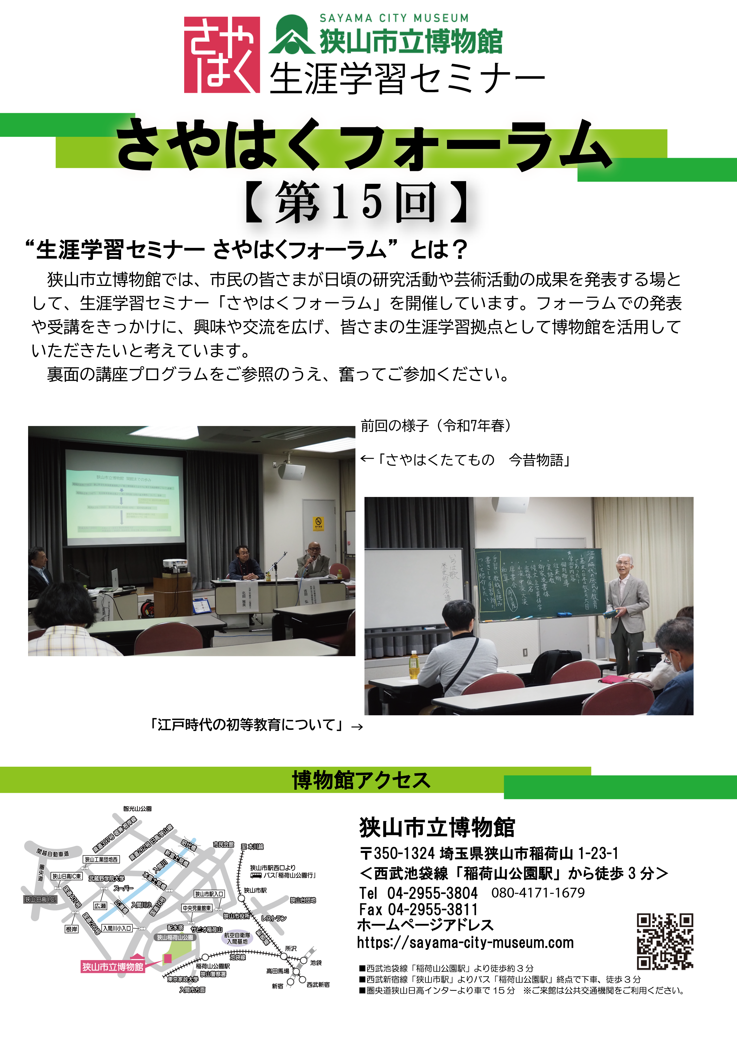 「さやはくフォーラム」とは、市民の皆さまが日頃の研究活動や芸術活動の成果を発表する場として開催する、生涯学習セミナーです。