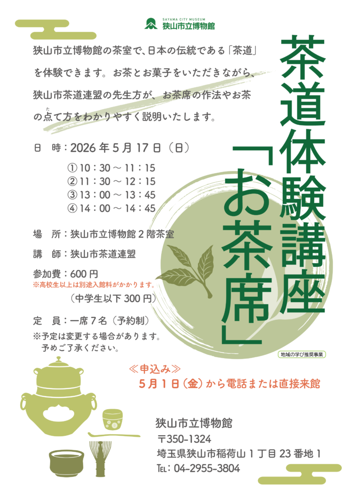 今年度最初の茶道体験講座「お茶席」を開催いたします。